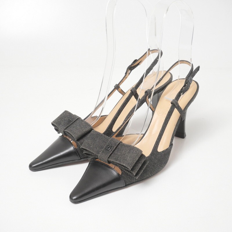 > MI7316■イタリア製 CHANEL シャネル CC ココマーク スリングバックパンプス ポインテッドトゥ デニム リボン 靴 36.5 23-23.5cm相当 黒