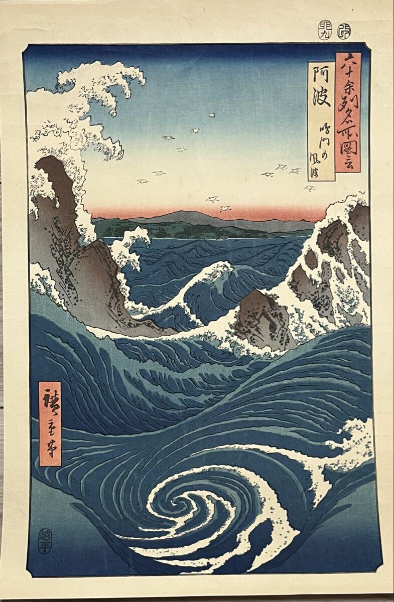 - 【真作】大正期 浮世絵木版画 歌川広重「六十余州名所図 阿波 鳴門の風波」大判 錦絵 保存良い
