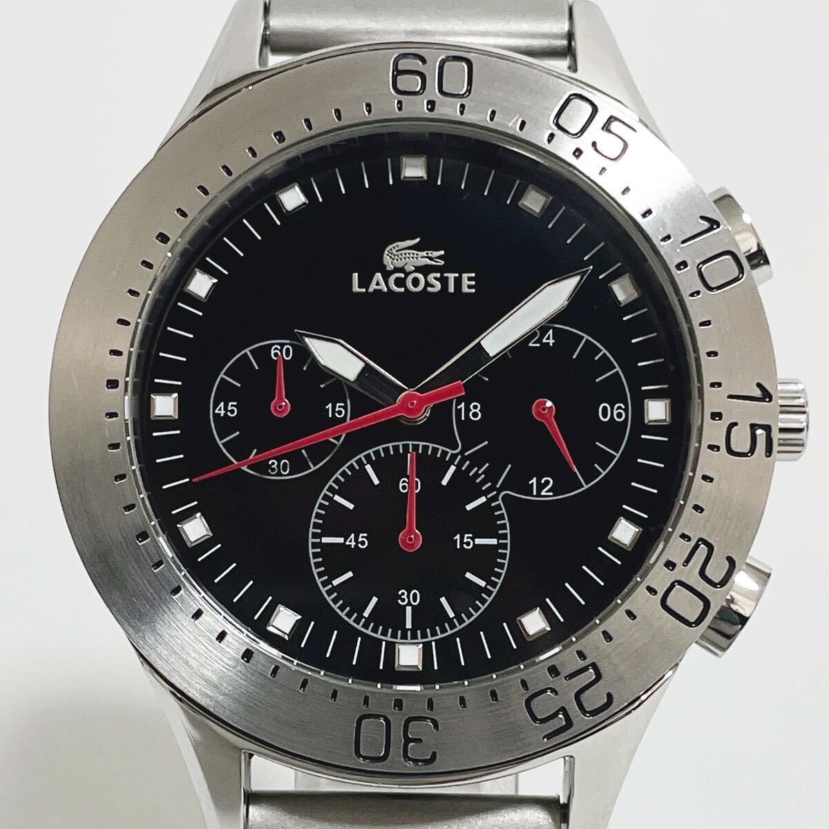 - 美品 稼働品 LACOSTE ラコステ 1500C クロノグラフ ブラック/黒文字盤 シルバー 回転ベゼル QZ クォーツ メンズ腕時計 新品電池交換済み