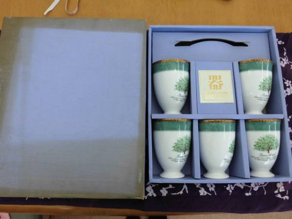 - ●洋食器セット 陶器製 フリーカップ⑤、 中皿① 白xグリーンx金彩