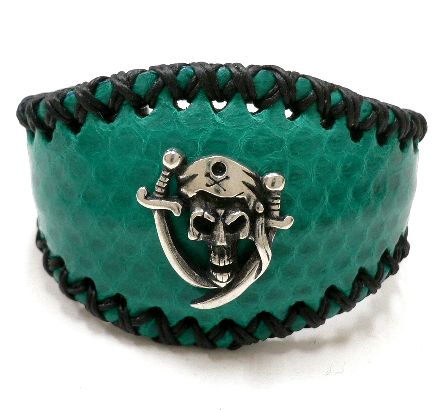- 牛革×海蛇革シースネイク緑レザー バングル スカル髑髏コンチョ付/フリーサイズ