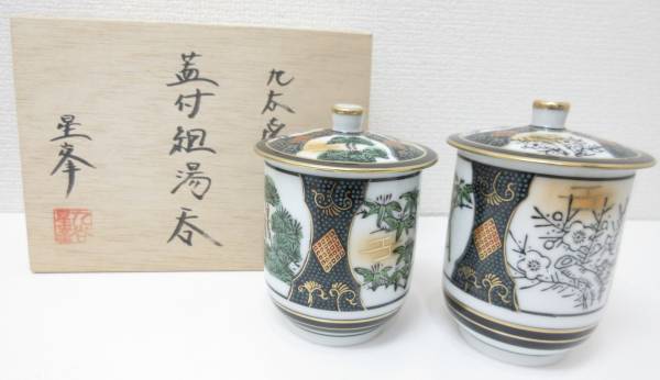 - 未使用品■九谷焼 星峯作 蓋付組湯呑 夫婦湯呑 松竹梅 木箱入り 管理1705 C-10