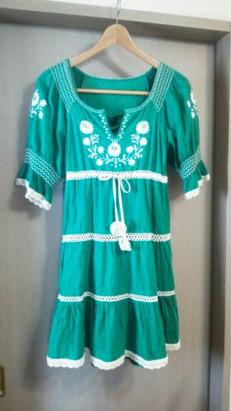 - Dgrace ディグレース グリーン 緑 ワンピース チュニック 刺繍 フォークロア ボタニカル カットワーク ハワイアン バカンスに