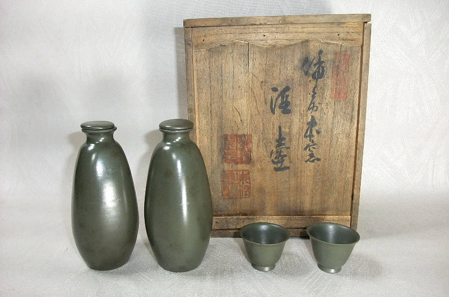 - 【睦】青備前 窯変 江戸期 備前本窯 酒壷 一対 時代物 希少 骨董 共箱■