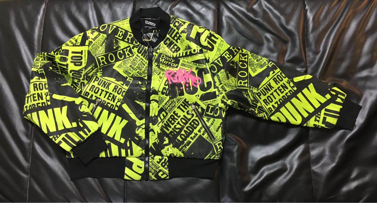 - SUPER LOVERS/リバーシブル ブルゾン/表→ネオンイエロー ロゴ総柄 裏→黒×ネオンイエロー星柄/レディース フリーサイズ/難あり