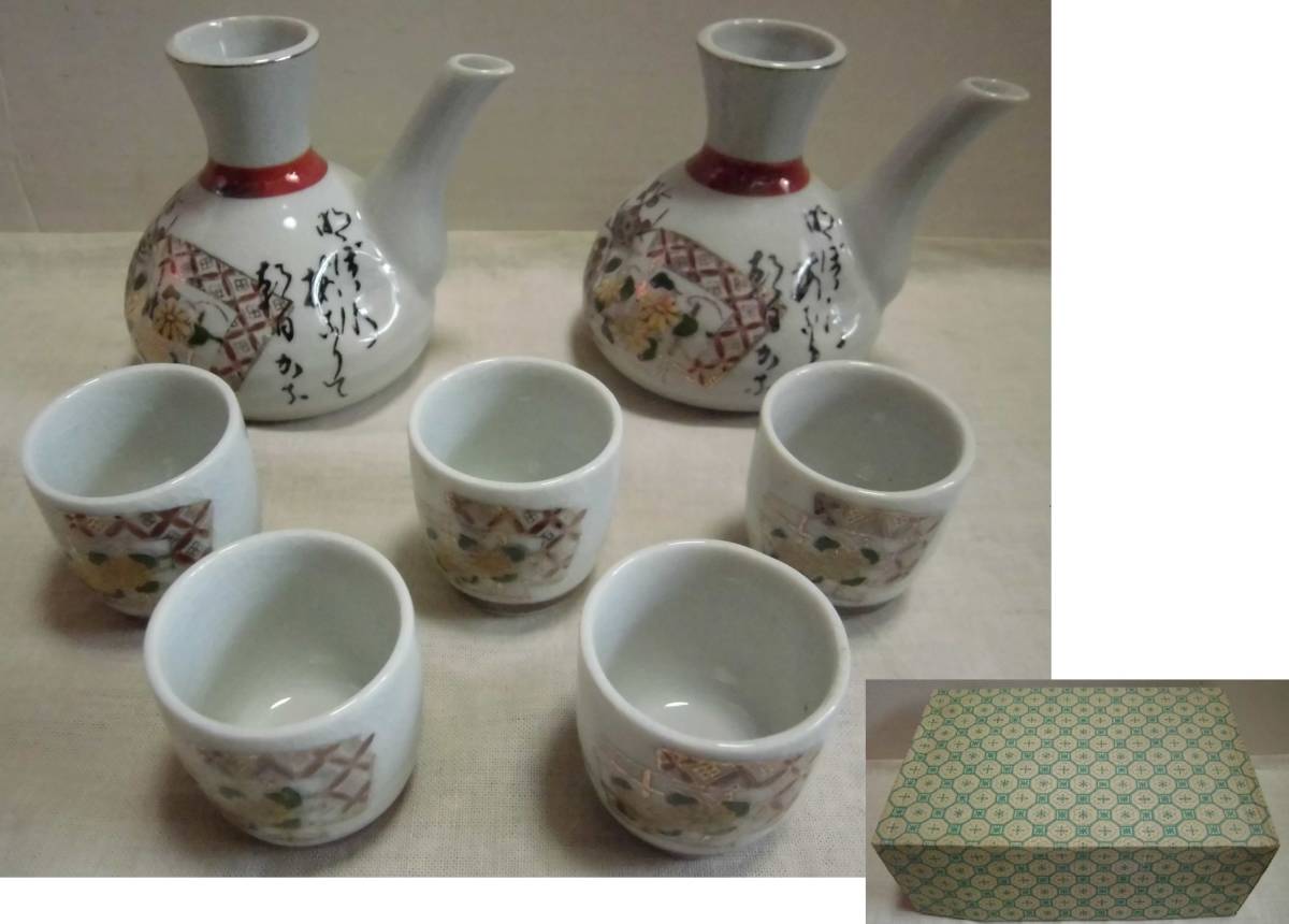 > 燗酒器 銚子 2個 お猪口 5客 箱入り 金彩 花柄 梅 焙り燗 徳利 ぐい呑み 盃 杯 工芸品 陶器 レトロ