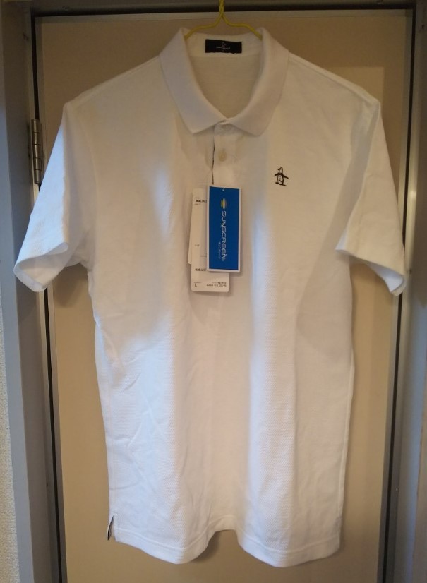 > 幻の商品 サンプル品 一点物? マンシングウェア ゴルフ ポロシャツ UVカット 粗め鹿の子 半袖 白 L・身幅約53.5cm※未使用/タグ付き/珍品