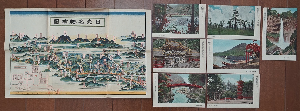 - 日光名勝 絵葉書カラー7枚 紙袋付き :紙袋裏に日光名勝鳥瞰図入り・東照宮・中禅寺湖・戦場ヶ原・湯元温泉・華厳の滝