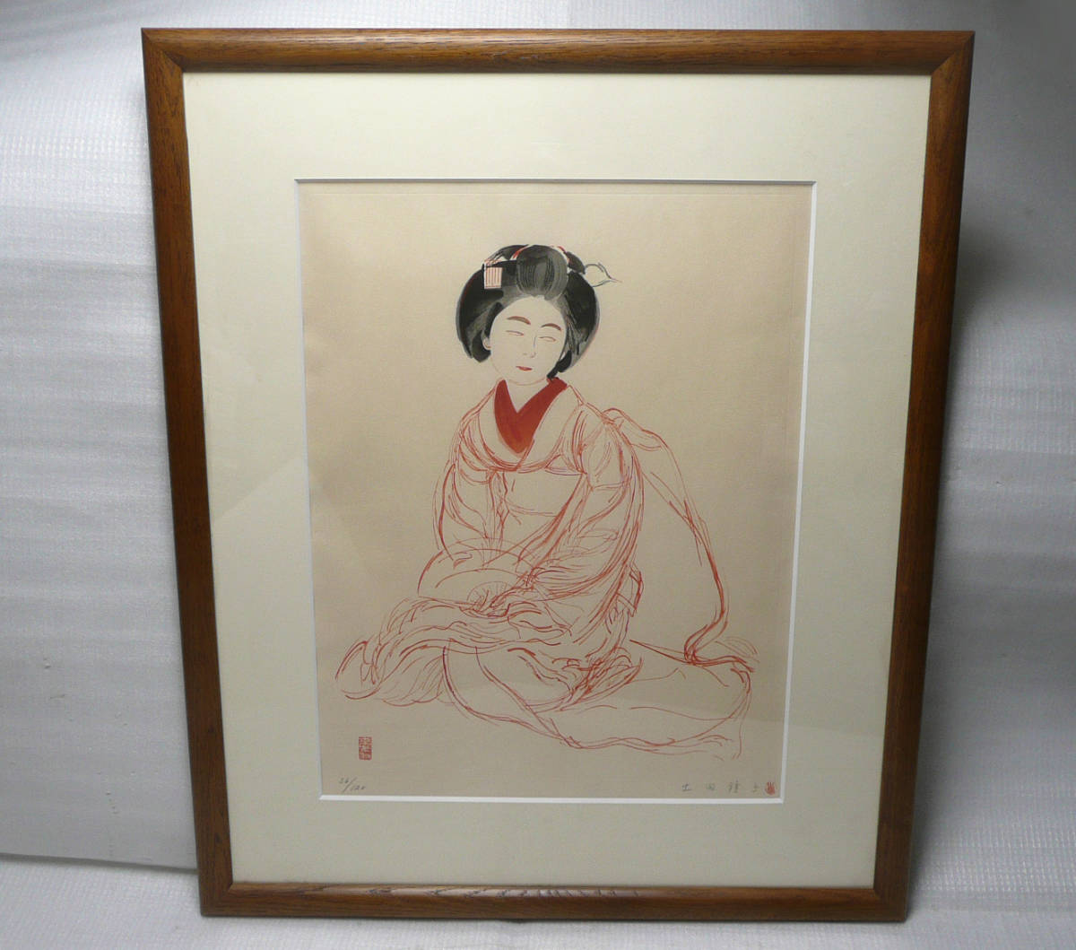 - 額装◆ 36/120◆朱色◆ 土田麦僊 ◆舞妓 参◆ 土田鏡子 銘印有◆ 木版画