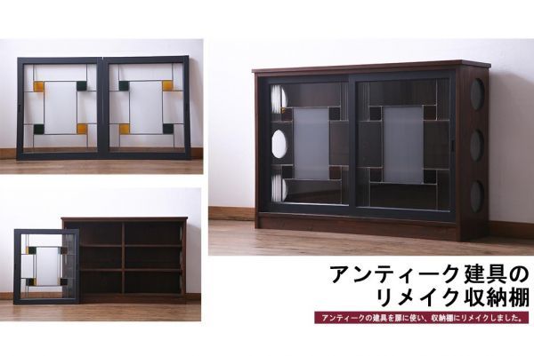 - R-033936 当店オリジナル 古建具リメイク ノスタルジックな当店製作のステンドグラス入り戸棚(収納棚、サイドボード)