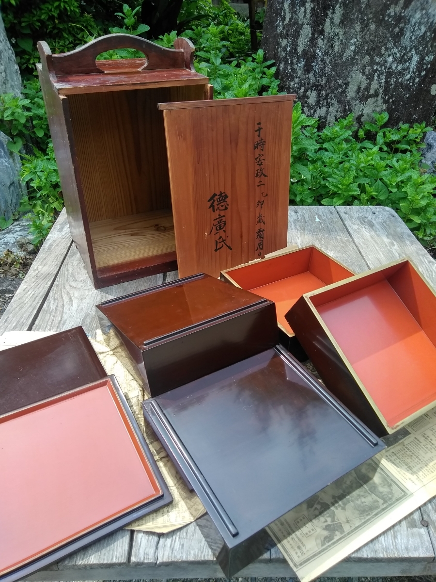 - 幕末安政の漆芸4段重(内朱・外黒・金縁) 持ち手付保管共箱