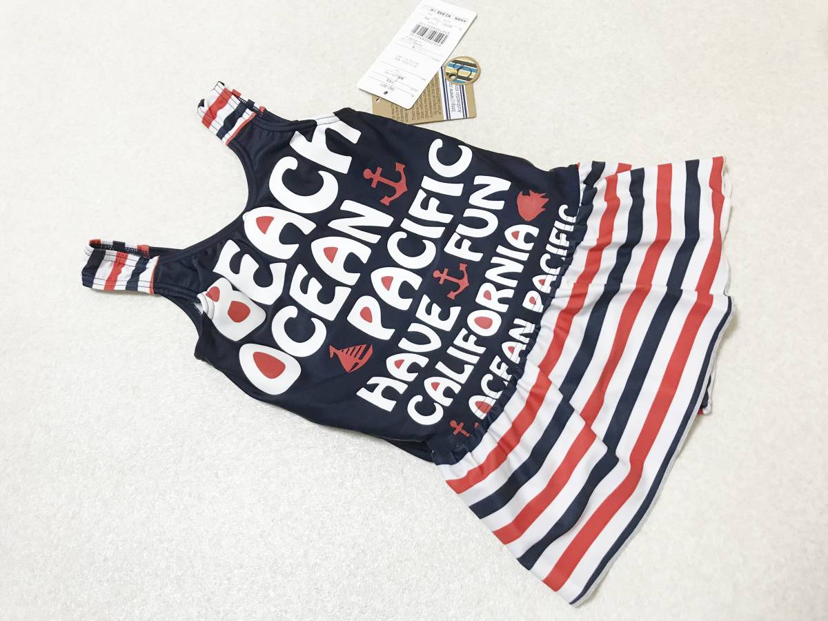 - 女の子水着 110サイズ:オーシャンパシフィック【OP】ひらひらスカート水着・ワンピース水着/マリンボーダー