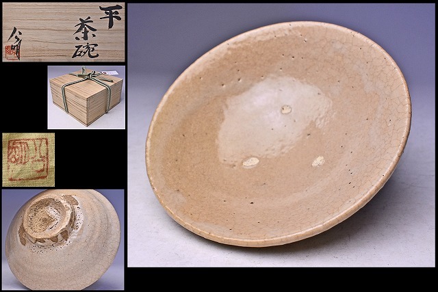 > 竹内公明 ★ 常滑 平茶碗 ★ 共箱共布 ★ 萩焼を思わせる茶映りの良さそうな逸品 ★ 山茶碗風 ★検 江崎一生 大迫みきお 常石窯 ★