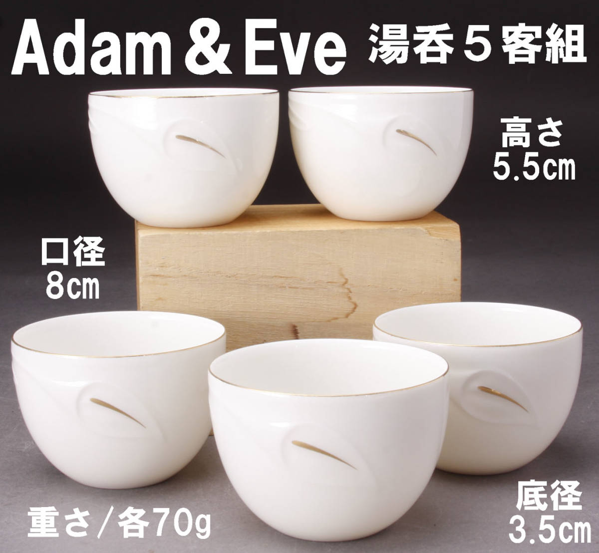 > アダム&イヴ 湯呑5客揃い 白磁/金彩 口径8㎝ 高さ5.5㎝ 底径3.5㎝ 各70g 中古 KA-7374