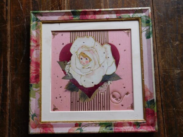 - 木製ガラス額 バラの作品ピンク ゆうこ作 26x26d2cm