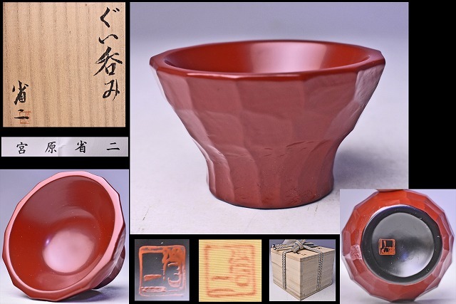 - 宮原省二 ★ ぐい呑 ★ 共箱共布栞 ★ 漆器 ★ 朱漆 根来風 ★ 力強い削りに朱が美しい逸品 ★ 木曽 ★
