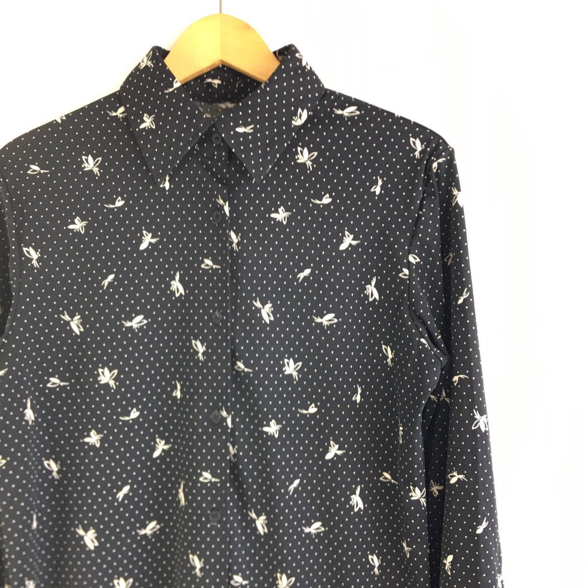 > ビンテージ 80s【総柄】ブラックベース ポリシャツ 日本製 長袖シャツ 古着 国産 水玉 フレア 花柄 昭和レトロ ヒッピー ディスコシャツ 黒