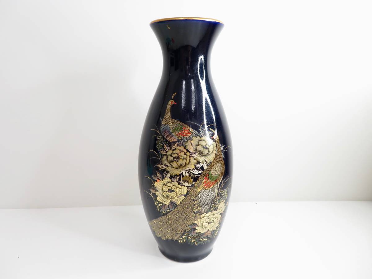 - ◆九谷焼 花瓶 孔雀 花柄 金彩 紺色 壺 花器 花生 伝統 工芸品 陶器 未使用品 管理2004 F-11