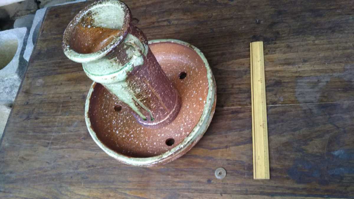 - 伊賀焼 土器風はけ目に釉薬 花台と花器の揃 やきもの 在銘あり