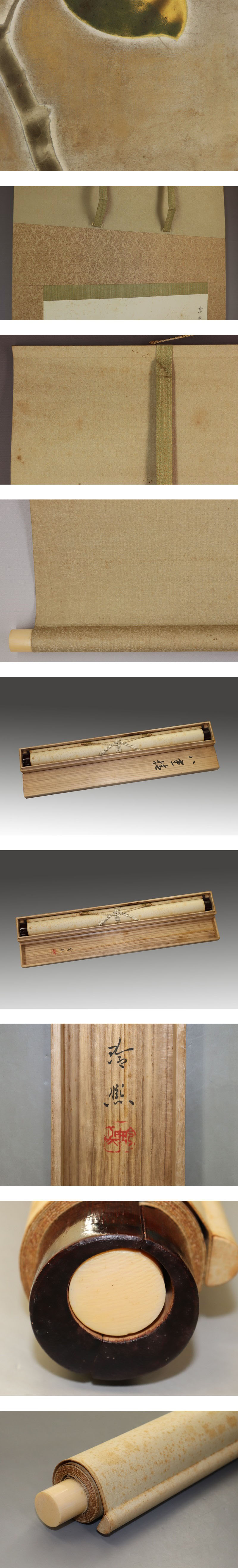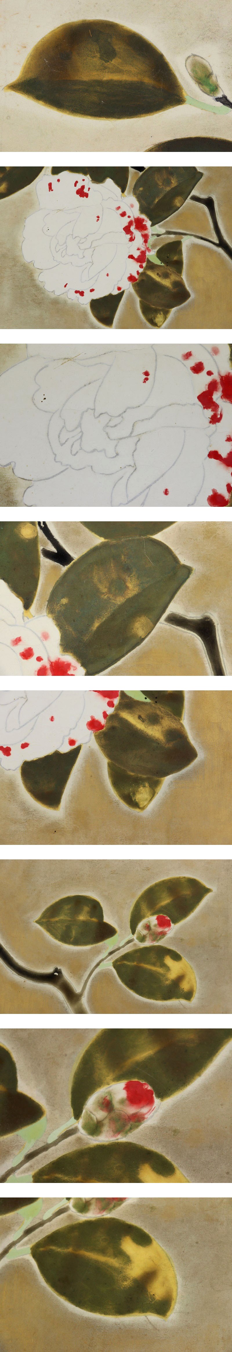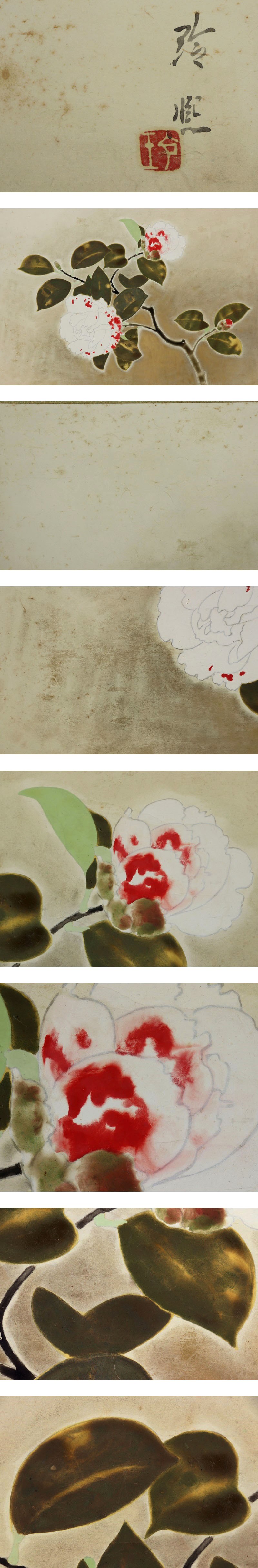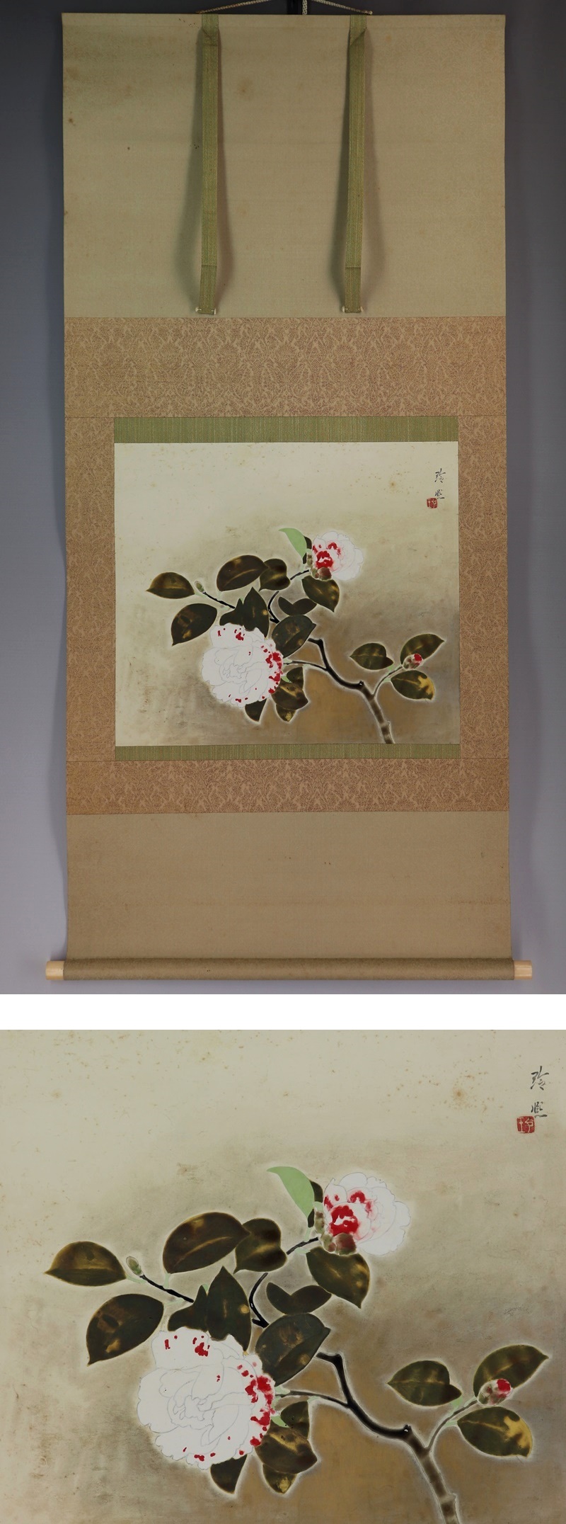 - 【真作】山口玲熙【八重椿】◆紙本◆共箱◆太巻掛軸 w07009