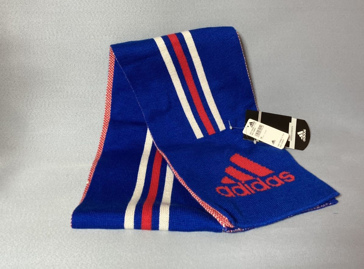 - 送料無料 adidas originals 赤白ストライプ ロゴ マフラー 国産 アディダス オリジナル スカーフ ブルー系 青 アクリル素材