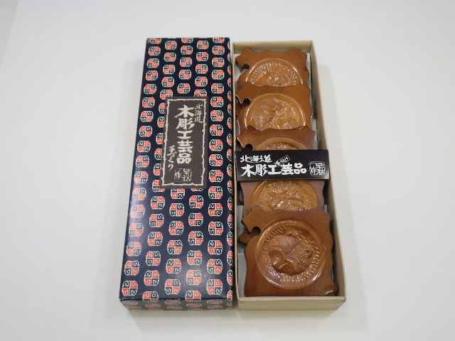 - h5B090Z- 未使用品 北海道 木彫工芸品 早秋作 手づくりコースター 5客 箱入