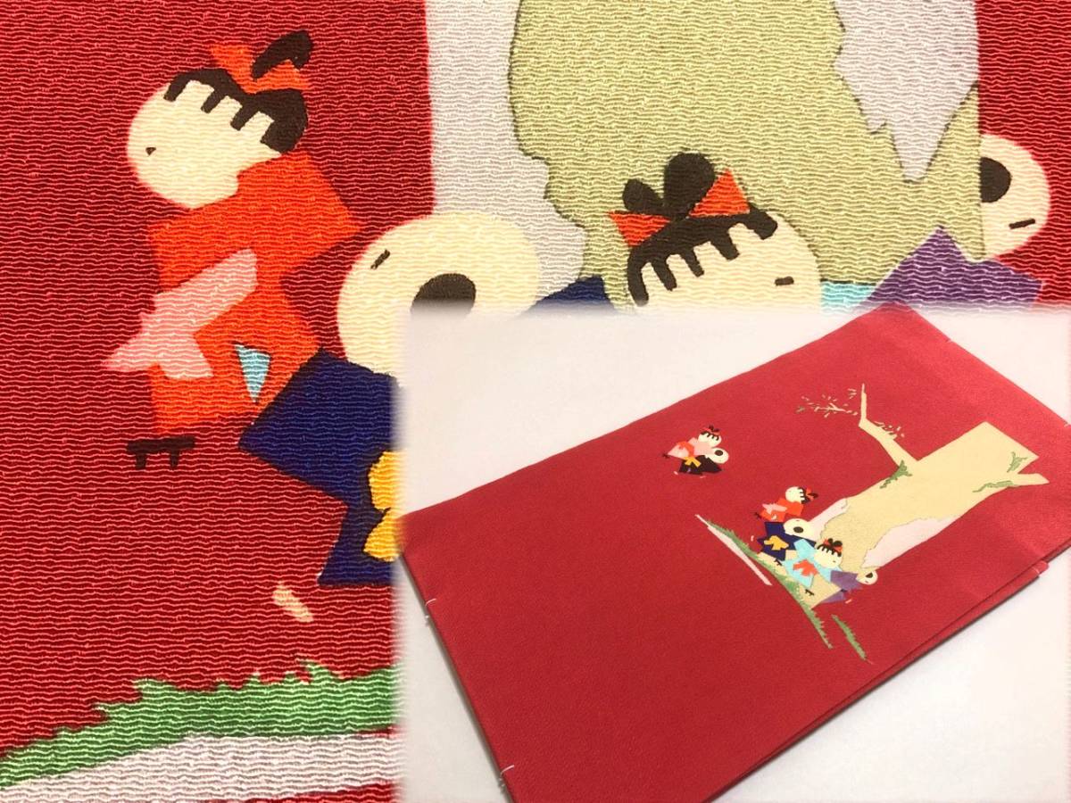 > K12 未使用 九寸 名古屋帯 正絹 仕立上 縮緬地 紅唐色地 遊ぶ童子文 長3m65cm