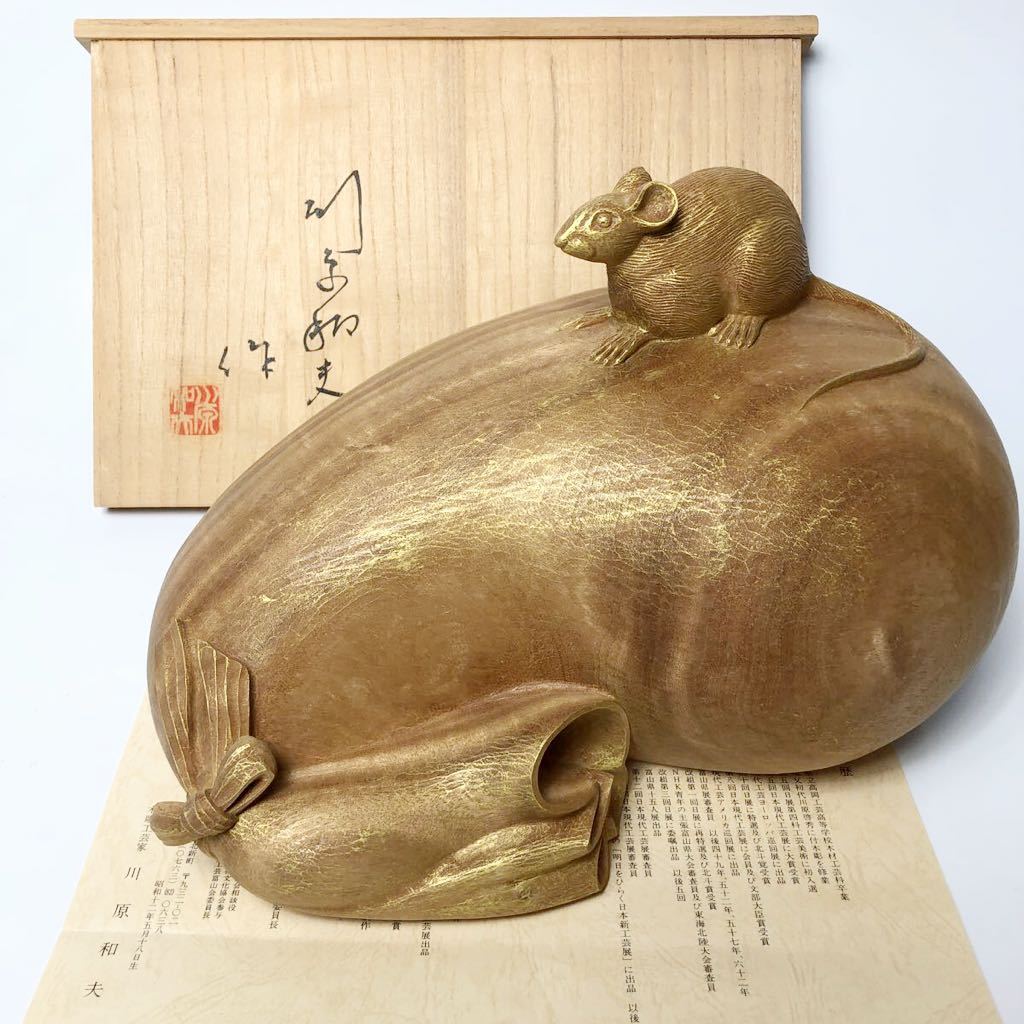 - ★ 最上位作! 川原和夫 本榧 金彩 木彫 福鼠 (共箱共栞)W31.0cm 井波彫刻 子
