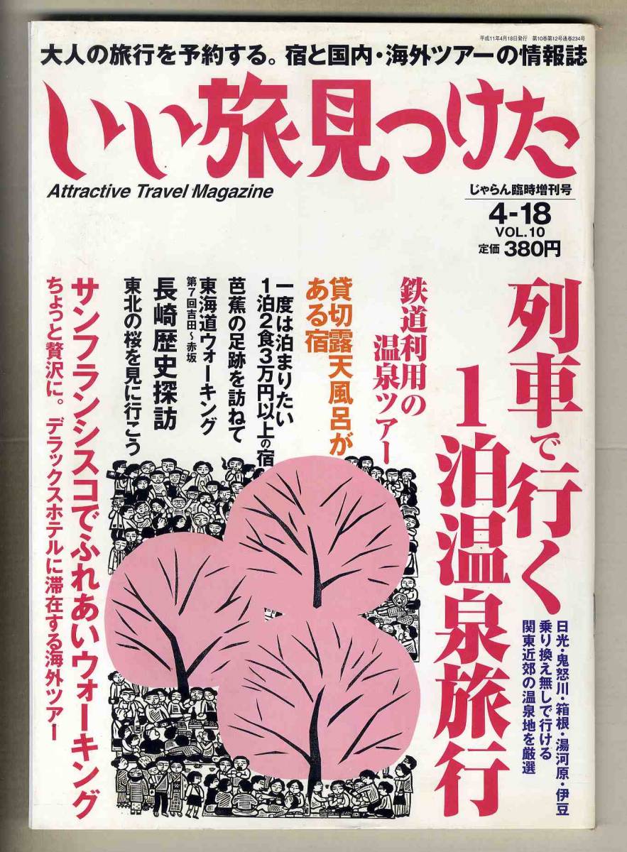 書名: 99.4.18 いい旅見つけた/列車で行く1泊温泉旅行、貸切露天風呂がある宿、サンフランシスコでふれあいウォーキング、東北の桜を見に行こう、長崎歴史探訪、芭蕉の足跡を訪ねて、... [じゃらん臨時増刊号]