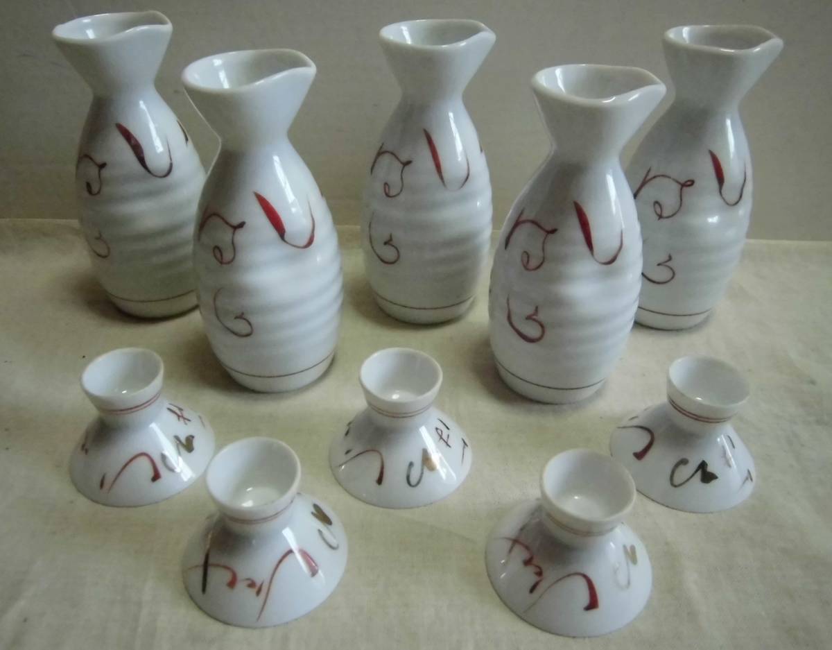 - 古い 徳利 5本 お猪口 5客 白磁に文字柄 いろはにほへと 金彩 ぐい呑み 盃 杯 酒器 陶器 工芸品 レトロ アンティーク