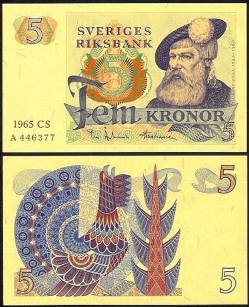 - (B-641) スウェーデン 5クローナー紙幣 1965年
