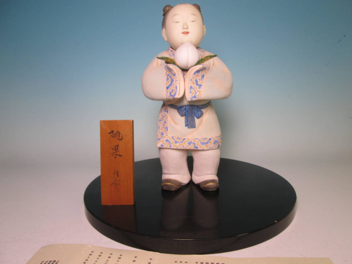 - ☆博多人形師 中村信喬作 「桃果」 黒漆塗台付 共ケース付 21,8cm 伝統工芸人形師 天平衣装人形A-1