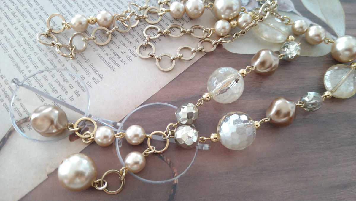- □上品カラー□J刻印□シャンパンカラー・パールビーズ&ゴールドカラーチェーン・ネックレス□