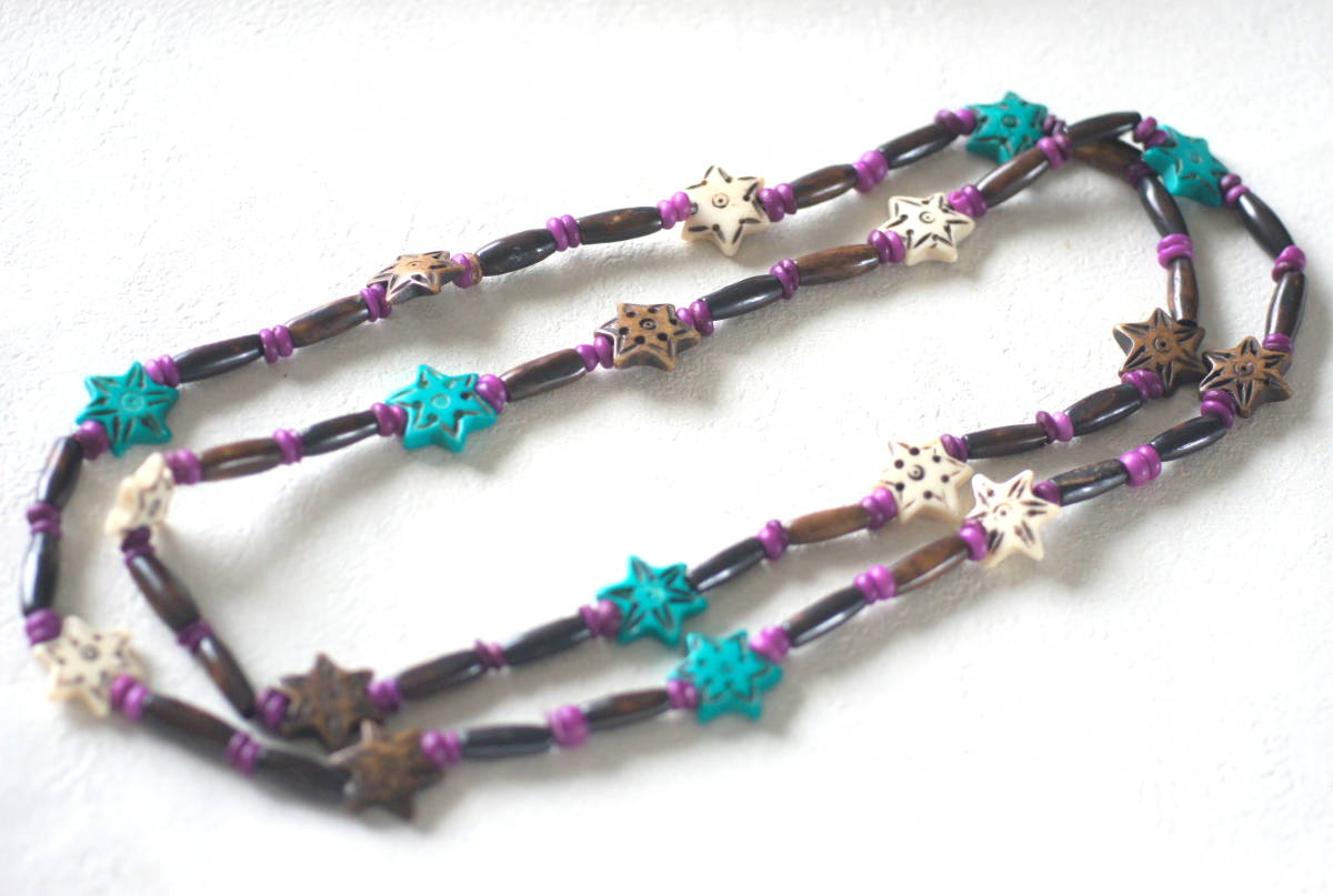 - アジアン・エスニック カラフル 個性的 骨ビーズ 魔法使いみたいな 六芒星 ロング ネックレス ボーンビーズ