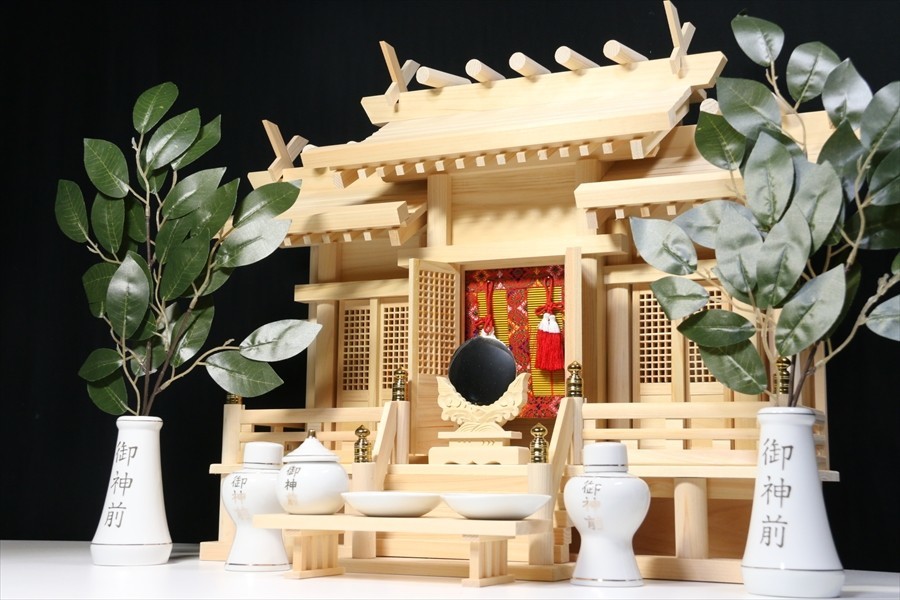 - 美しい、東濃桧■高床仕様 三社 屋根違い 中型 ■御簾と格子扉 ■神棚セット(お社本体)高さ49cm×幅64cm×奥行き26cm