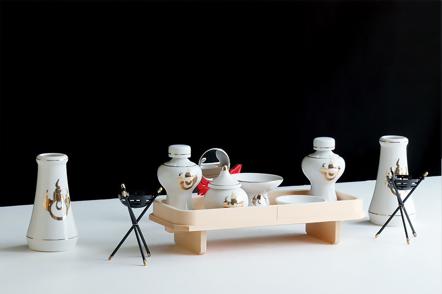 - 稲荷紋入り 神具セット 13品目 ■ 高杯仕様 ■ 木曽ひのき製 長膳付 ■ 小・中型 神棚 に最適 土器セット ■ 真鍮製 金属本鏡