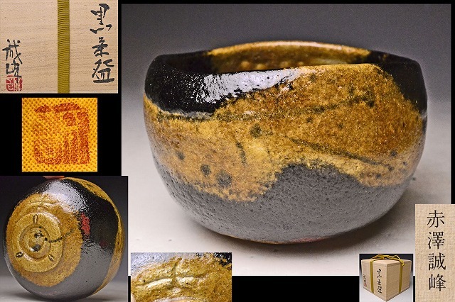 > 赤澤誠峰 ★ 黒楽 帯文 茶碗 ★ 共箱 共布 栞 ★ 景色抜群で手取りの良い名碗 ★ 茶道具 ★