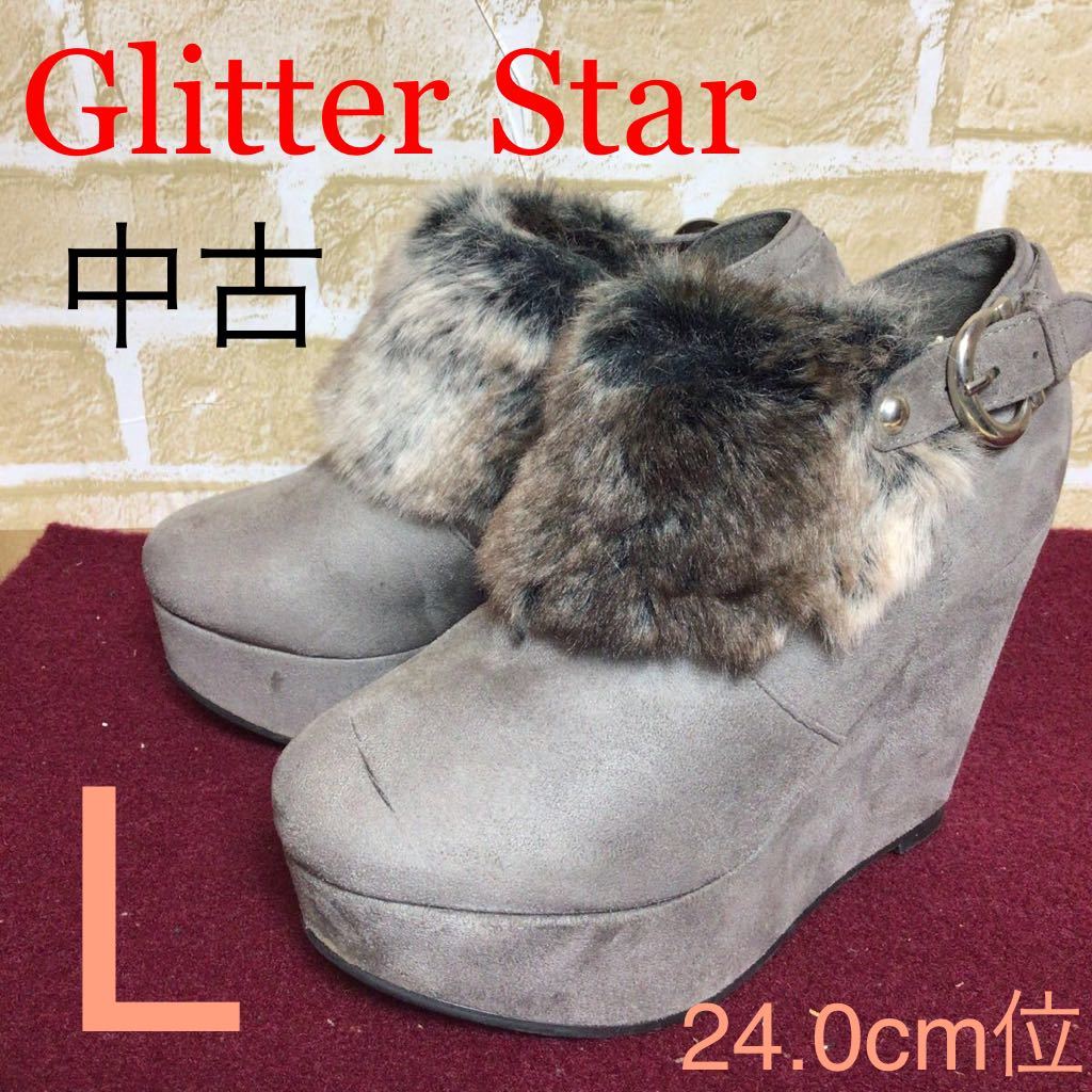 > 【売り切り!送料無料!】A-147 Glitter Star!厚底ファー付きショートブーツ!L 24.0cm位!グレー!スエード!秋冬!再流行中!中古
