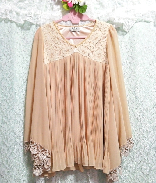 - 亜麻色着物風フリルシフォン長袖チュニックネグリジェ Flax color frill chiffon long sleeve tunic negligee dress