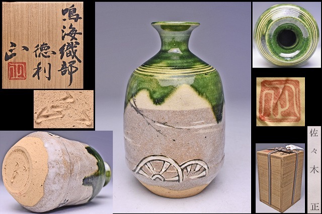 > 佐々木正 ★ 鳴海織部 徳利 ★ 共箱 共布 栞 ★ 師:人間国宝 加藤土師萌 / 加藤幸兵衛 ★ 緑釉が美しい逸品 ★ 酒器★