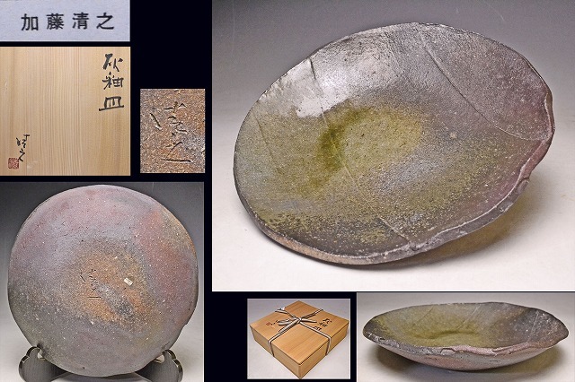 > 加藤清之 ★ 灰釉皿 ★ 共箱栞 ★ 検 勅使河原蒼風 草月流 オブジェ ★ 炭化灰釉見事 ★ 瀬戸焼