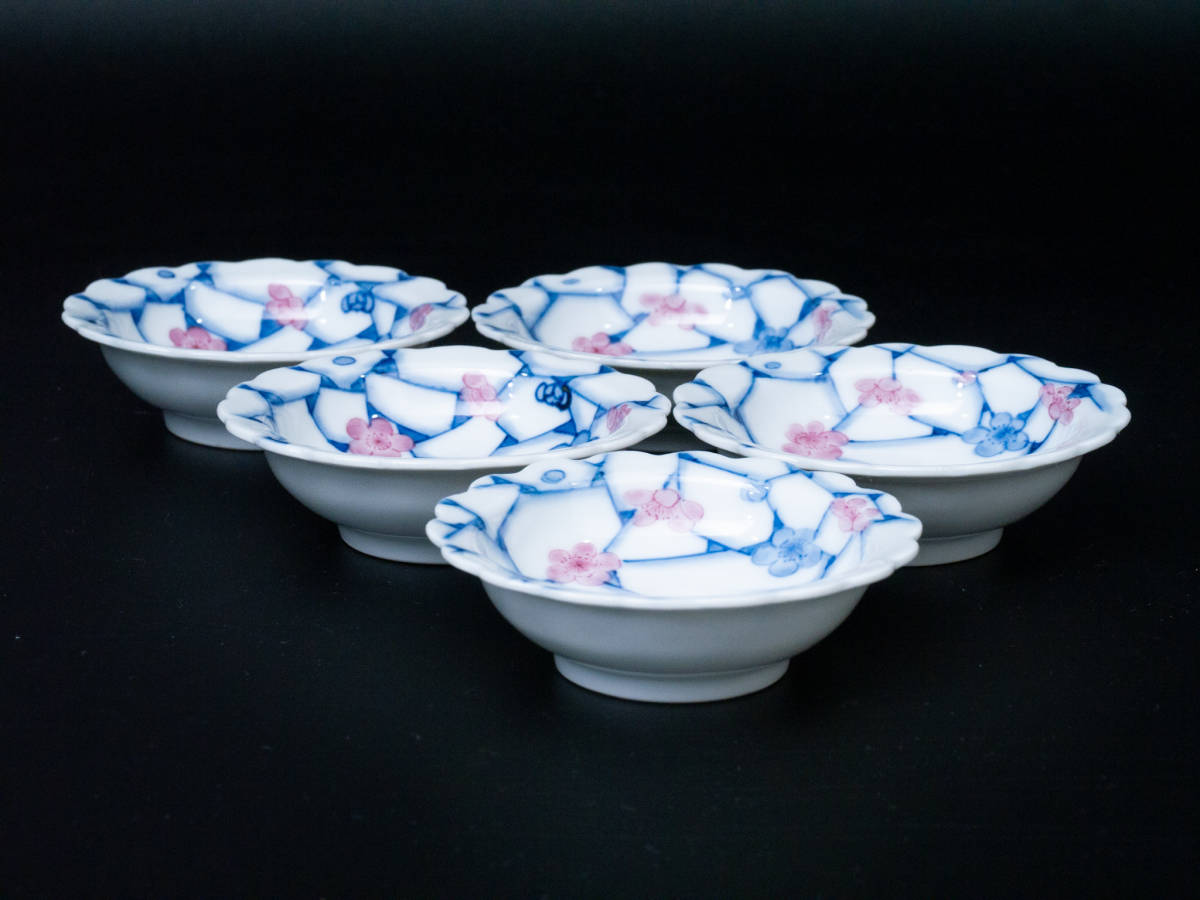- 【値下げ交渉有り】 明治~大正期 幻の源六焼 富永源六 造 染錦 花散らし 輪花 豆皿 5枚 合箱