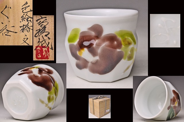 > 高橋誠 ★ 色絵 椿文 ぐい呑 ★ 共箱 ★ 師:人間国宝 藤本能道 ★ 優しい筆致が暖かな逸品 ★ 酒器 ★ 京焼 ★
