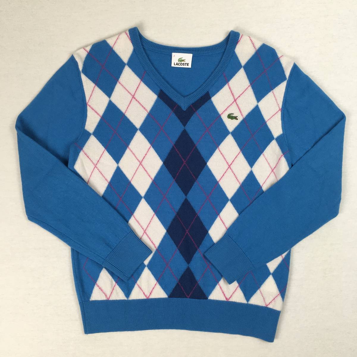 - LACOSTE ラコステ セーター Vネック AH088E 日本製 サイズ2 アーガイル柄 ウール 長袖 水色