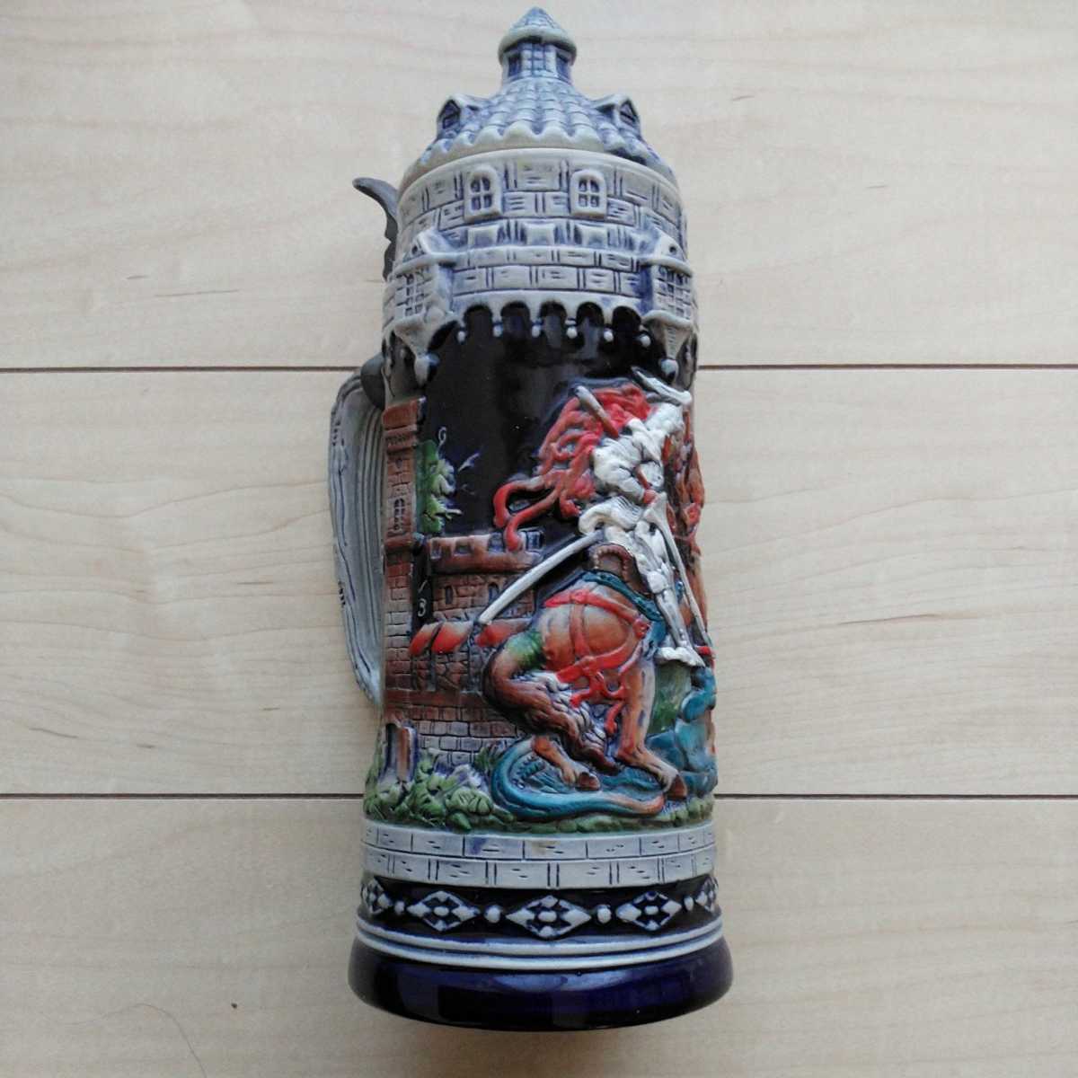 > ■『西獨製(WestGermany)のBeerjug』1個。城廓を護衛する騎士が闖入した野獣を槍で一突きの図柄。1985年西獨で購入。注げる容量1Liter。
