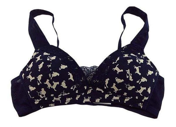 > SI6545-6◇ 新品 ブラジャー ノンワイヤー パッド付き サイドボーン有り 肩紐調整可 猫柄 カップ上部レース A70 ネイビー