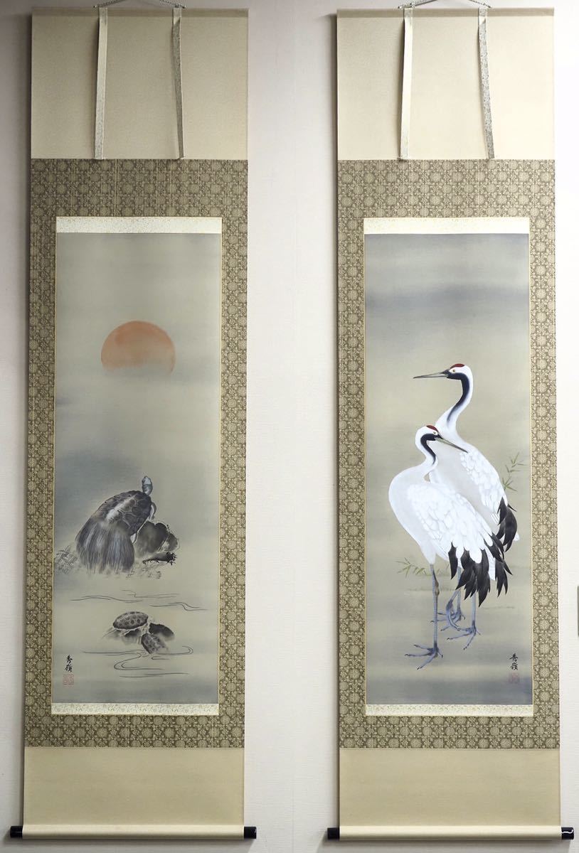 - 新品未使用 掛軸 中川秀嶺 真筆 鶴亀 双幅 尺五立 縁起物