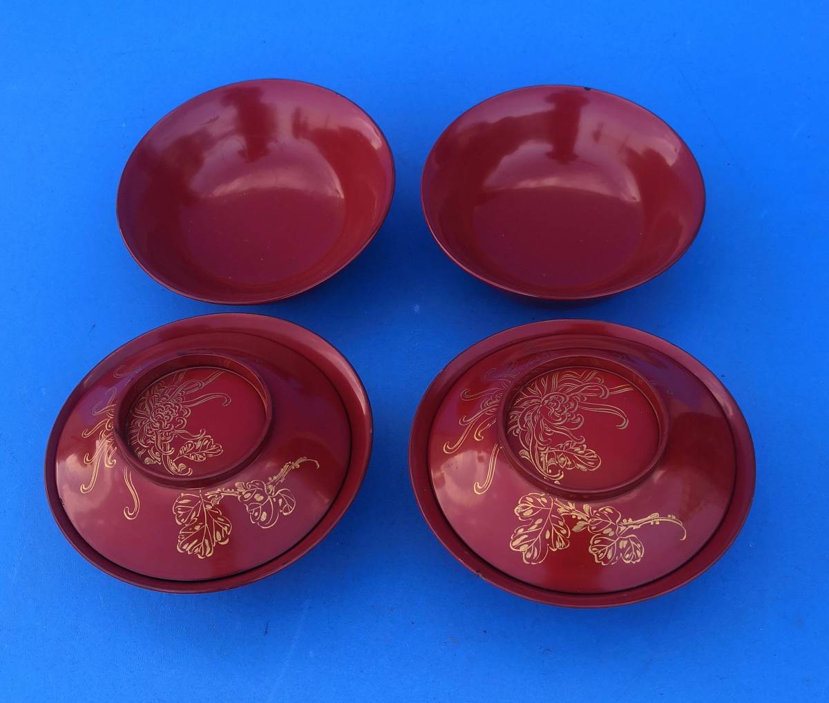 - 昭和レトロ漆塗り椀4個内2個は蓋付木製に漆塗り仕上げ