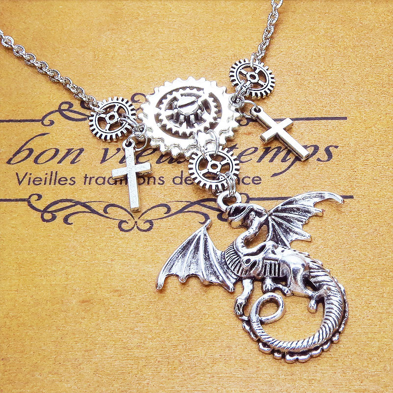 - アンティークシルバー ドラゴンと歯車の本格的スチームパンクネックレス ロザリオ アジャスター 長さ調整可