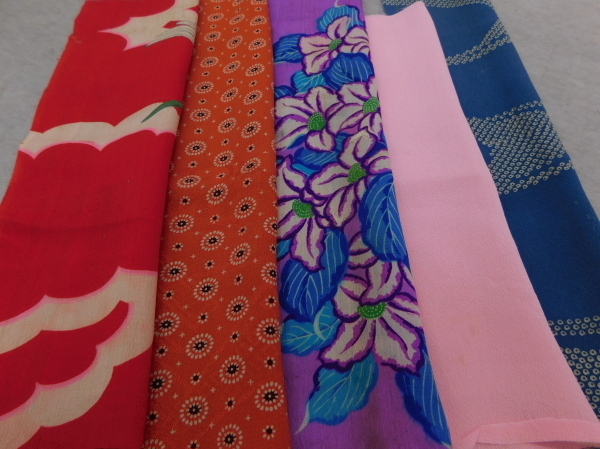 > 〔楽布〕P8017 正絹 古い錦紗縮緬布 5枚組 約29.5~44cm 大正ロマン k